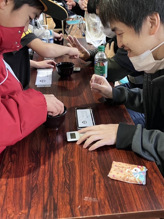 1分間の制限時間内に、サイコロで「1の目」を何回出せるかを競うゲームです。お椀の中でサイコロを振り続けます。