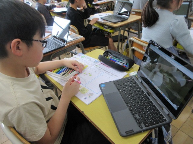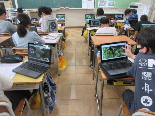 4年生の理科では、春の生き物の様子を調べる学習をしています。今日は校庭のハナミズキを詳しく観察しました。子ども達は学習端末を手に、ただ撮るだけでなく「多面的・多角的」な視点で撮影に挑戦!「上から見るとどうかな?」「花の裏側はどうなっているんだろう?」と、端末を近づけたり(アップ)、全体を捉えたり(ルーズ)しながら、納得のいく一枚を収めていました。教室に戻ると、撮影した写真を拡大して細部までじっくり観察し、ノートに丁寧にスケッチ。デジタルの便利さと、自分の手で描くことによる気づきを組み合わせ、学びを深めている姿に成長を感じました。