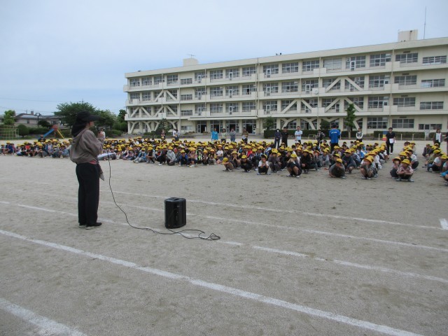 子どもたちは、先生の話をよく聞き、「お・は・し・も(おさない・はしらない・しゃべらない・もどらない)」の約束を守りながら、落ち着いて行動することができました。地震のときは、机の下にもぐって頭を守る練習をしました。その後、火事を想定し、煙を吸わないようにハンカチなどを使って口を覆い、運動場まで安全に避難しました。