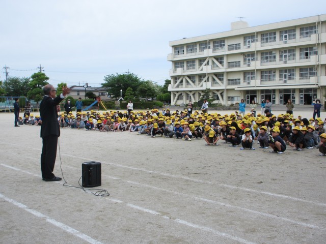 今年度の市内37小学校を代表して、松山小の1年生が春日井市長さん・春日井警察署長さん・春日井市教育長さんから、児童一人一人に直接黄色い帽子を手渡していただく式典がありました。1年生のみなさん、明日から6年間の小学校生活を安全に過ごしてくださいね。