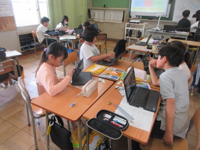 授業の様子です。1組は国語、会社活動で学級をアップデートする計画を立てていました。2組も国語、進出漢字を学習していました。3組は算数、長さの学習で教室の縦横の長さを測っていました。4組はは図工、読書感想画の準備をしていました。どのクラスも落ち着いた雰囲気で学習が進め、学習と生活のリズムを整えています。また、休み時間は暑さにも負けず、多くの児童が外遊びに向かっています。お茶やタオルなど、ご家庭でのご支援をよろしくお願いします。