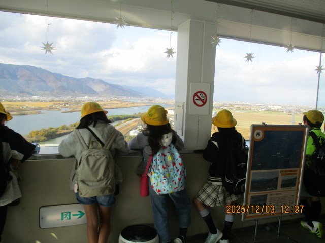 4年生は、社会科「きょう土の伝統・文化と先人たち」の学習として、輪中ミュージアム、木曽三川公園、治水神社を見学しました。スローガン「木 きそくを守り 曽 祖先から学ぼう 三 3クラスで協力 川 潜入調査!」を目標に、班活動も行いました。様々な展示やタワーからの景色について、用紙が足りなくなるほどメモをとっていました。木曽川・長良川・揖斐川の木曽三川下流域の様子や歴史、先人たちの工夫や努力について、学びを深めることができました。+7
