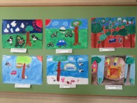 1組は、運動場で大縄跳びの練習をしていました。2組は、算数の授業をしていました。「15-6」の計算の仕方を学習していました。3組はテスト中でした。廊下には、葉を紙の下に置き色鉛筆でこすって描いた作品が...