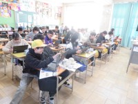 1組は放課の過ごし方について、先生の話を聞いていました。2組は書写の授業で、毛筆に取り組んでいました。集中して書いている姿がたくさん見られました。