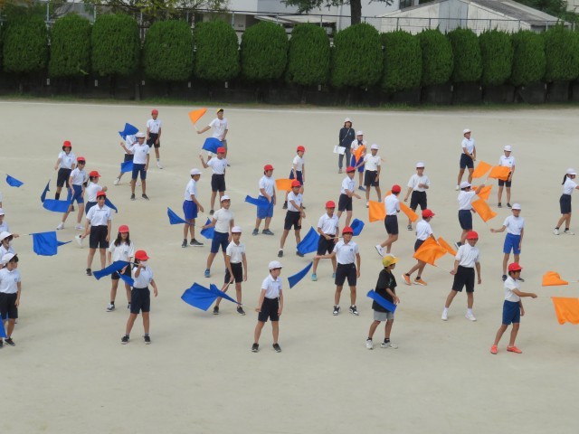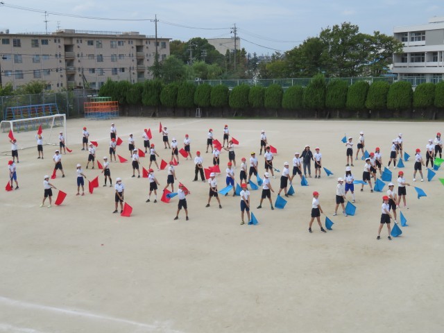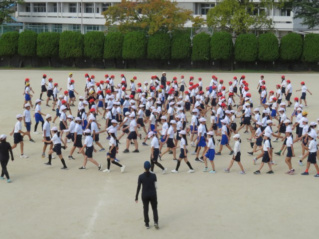 秋晴れの空の下、交差して歩く練習や立ち位置の確認をしていました。