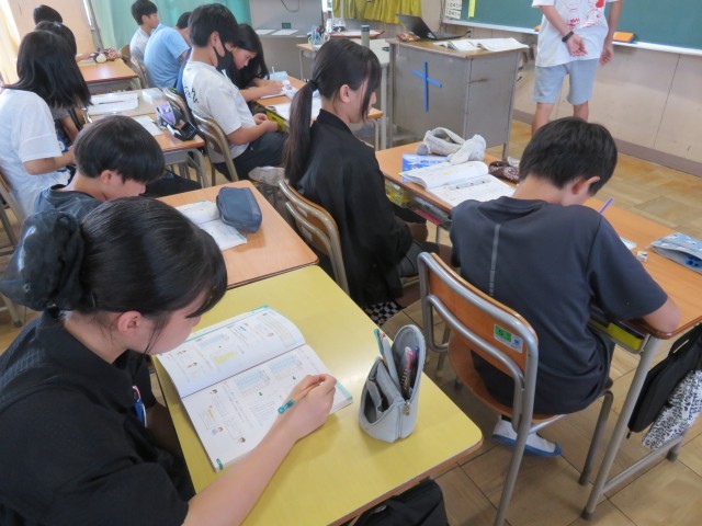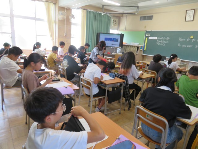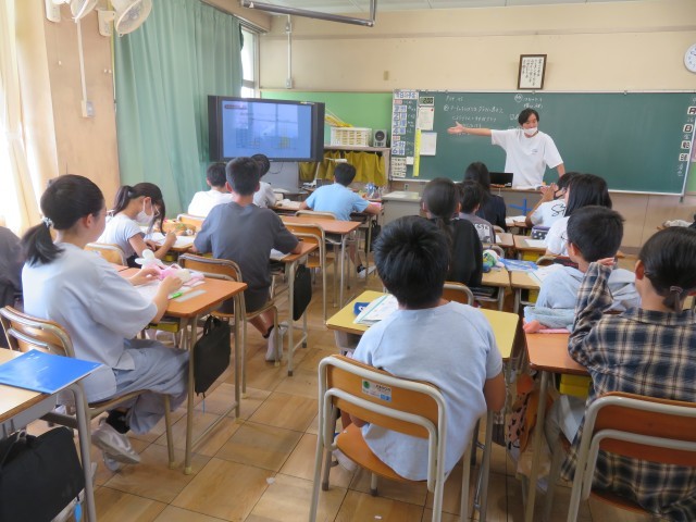 1組は国語の授業で、どうして「やまなし」という題名なのかを考えていました。