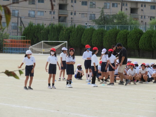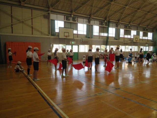 4時間目には、体育館でフラッグの立ち位置の確認をしました。