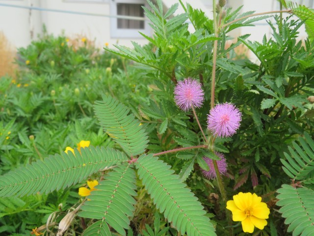 マリーゴールドの中に、可愛らしいピンクの花が咲きました。