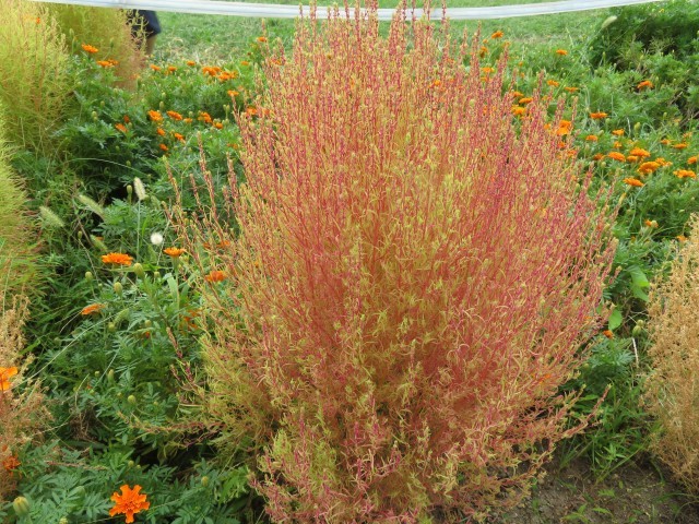 夏は黄緑色だったコキアは、赤く色づきとてもきれいです。
