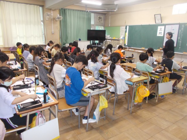 3組は書写の授業で、毛筆で「土地」の練習をしていました。