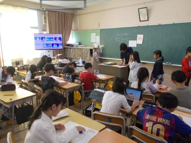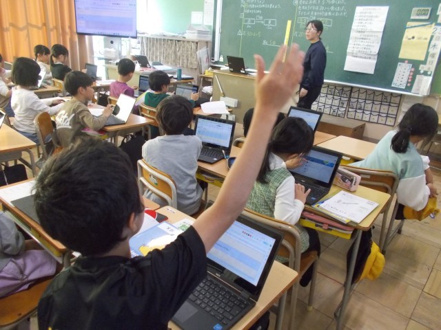 1組は算数の授業で、振り返りをスプレッドシートに書いていました。