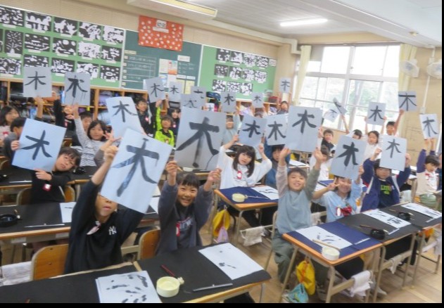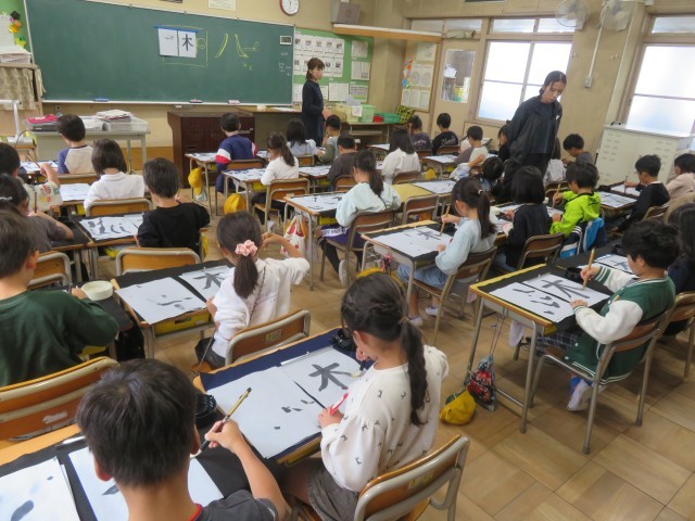 1組は水習字です。「はらい」を習い、最後に「木」と書きました。
