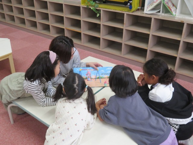 にじいろぽけっつの皆さんが、低学年図書室に読み聞かせに来てくださいました。