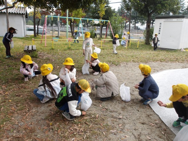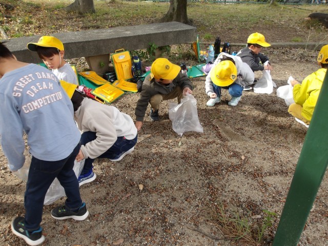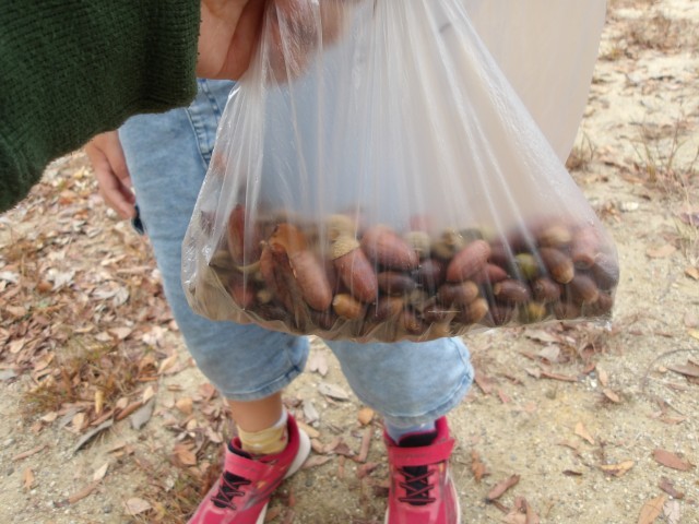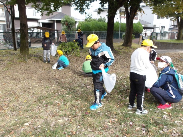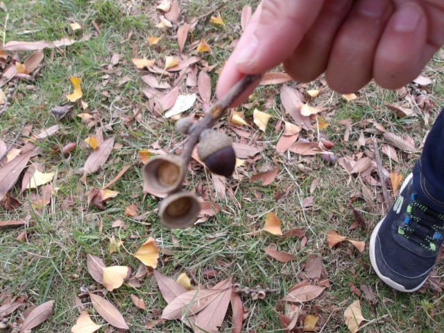 帽子をかぶったどんぐりや、まだ枝についたままの珍しいどんぐりを見つけ、袋いっぱいに拾って帰ってきました。これから、生活科でおもちゃ作りをする予定です。