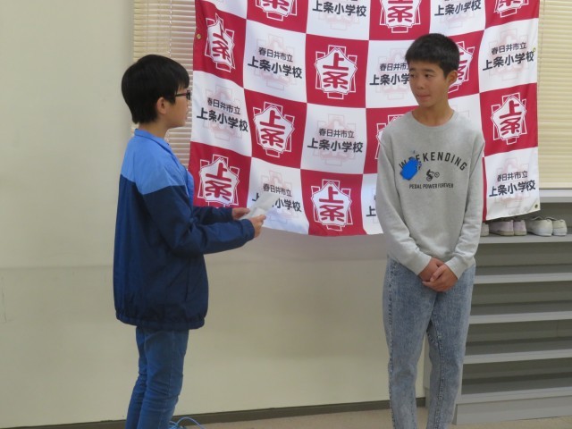 11月14日(金)の業前に行われた朝会の中で、表彰・壮行会・人権についての話がありました。作品コンクールや教育展、スポーツ大会などで優秀な成績を収めたたくさんの児童が表彰されました。また、愛知県市町村対抗駅伝競走大会に春日井市代表で出場する児童を激励する壮行会も行われました。最後に、児童会役員による「人権とは何か」という説明、校長先生から人権についてのお話がありました。児童会役員の発表態度・内容が大変すばらしかったので、朝会後に校長先生から「とてもよかったよ」とお褒めの言葉をいただきました。