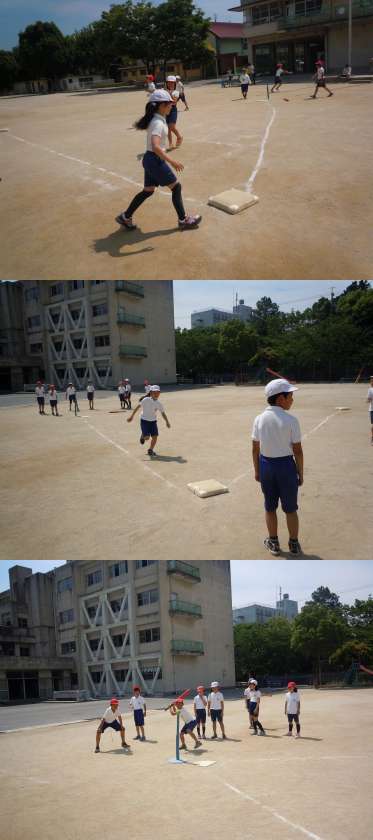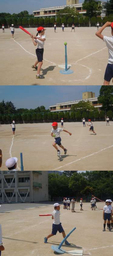 体育の授業で、ティーボールをやっていました。昔のハンドベースボールという種目を、よりたくさんの子どもが親しめるように改良されたものです。写真のように、ボールは、ゴム製のティーの上に置いてあるので、慣れていない子でも打ちやすくなっています。ピッチャーがいなくても、成り立つ競技です。また、ボールも適度な大きさと硬さがありとりやすくなっています。