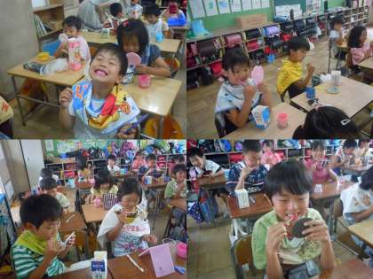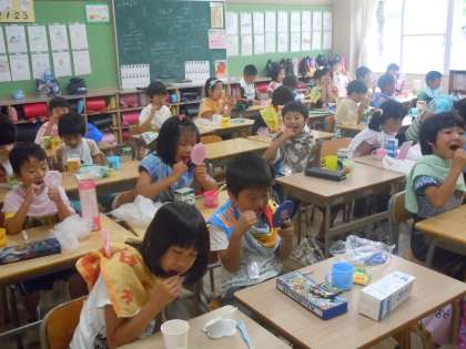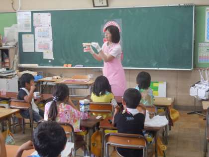 歯科衛生士さんによる歯磨き指導がおこなわれました。歯をすみずみまで磨くには、歯ブラシの向きを変えながら、いろいろな場所にあててゴシゴシこすることを教えてもらいました。
