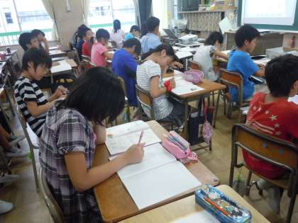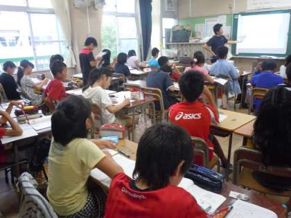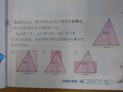 6年3組 算数の授業 公開日 2013/06/20 更新日 2013/06/20 トピックス 「文字を使った式」の学習です。三角形の面積は、長方形の面積の半分であることを、底辺をacmとして証明する学習です。3つの図の考え方に、あてはまる式を選択するという問題です。なぜ、その式を選択するのかが説明できるようにしていますが、子どもたちにはややハードルが高いかもしれません。