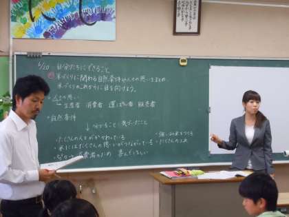 「米づくりにかかわる人々の思い」を考える授業です。この授業は、教師の授業研究会として、たくさんの先生が参観しました。