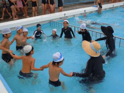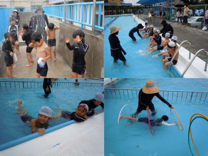 5・6組の子どもたちは、浅いプールで楽しく水遊びをします。水が顔につくのが苦手な子も、先生や友だちにはげまされてがんばっていました。