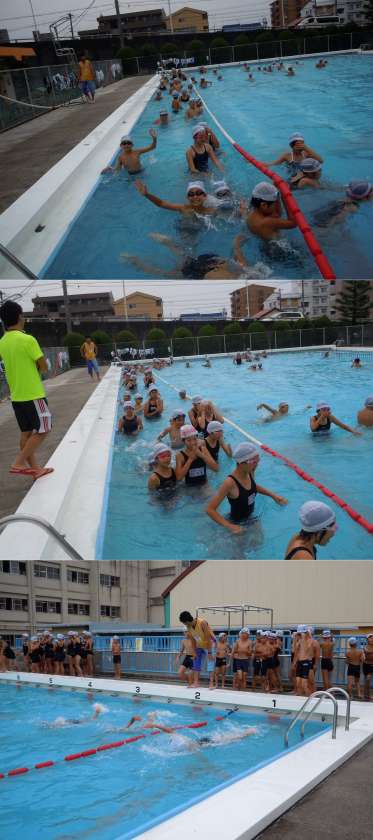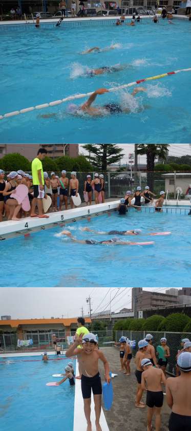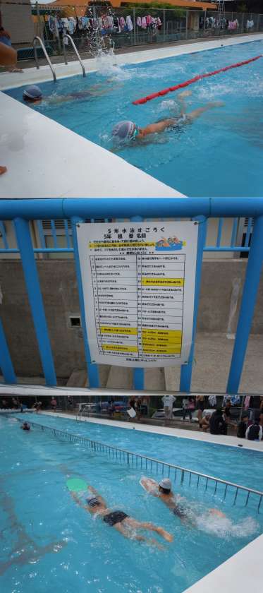 5年生 水泳 公開日 2013/06/25 更新日 2013/06/25 トピックス 5年生は、水泳の能力に応じて3つのクラスで別々の練習をしています。一番上級のクラスは、50mのタイムを測定していました。他のクラスは、ビート板を使ってバタ足の練習や伏し浮きの練習などスキルアップの練習です。 プールサイドには、「水泳すごろく」というボードが掲示してあります。