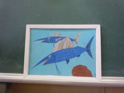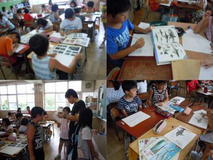 「砂絵」のデザインを下書きしていました。海の生き物がテーマのようで、魚図鑑などをみて、魚やイルカなどを描いていました。