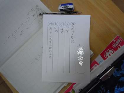 2年1組 国語 ことばであそぼう 公開日 2013/10/04 更新日 2013/10/04 トピックス 「折り句」というものです。頭の言葉をつなげると、「あいうえお」等になっていくという言葉あそびを自分で考えました。子どもらしい楽しい折り句がいくつもできました。