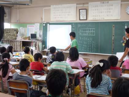 正比例のグラフを描く授業でした。表をもとにして、縦軸と横軸の目盛りをみながら、正確な場所に点を描くことができるかどうか確かめていました。前に出てきた子どもたちは、プロジェクターで投影された画面にマウスを使ってポイントするという作業も難なくこなしていました。