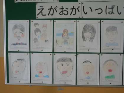 子どもたちに描いてもらった笑顔の絵がたくさん集まっています。全員の分は紹介できないのですが、週に1回のペースで中央廊下の掲示板を貼り替えています。