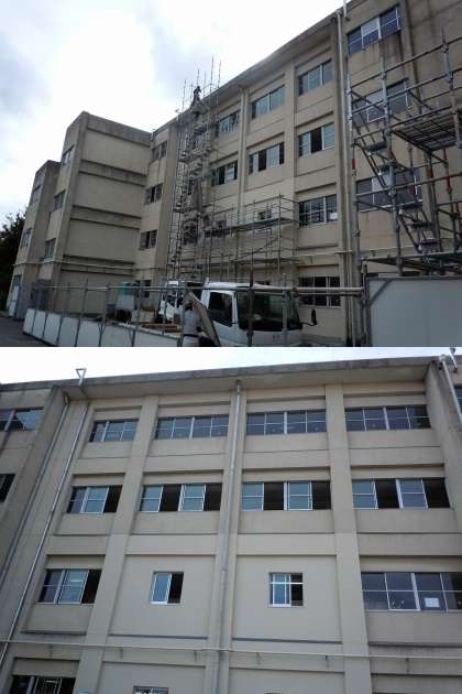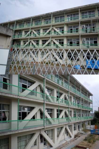 北館を覆っていた足場が取り外され、補強工事が終わった外観が見えてきました。南側には、補強の筋交いがはっきり見えています。北側も、窓の一部が新しく変わりました。工事をしたところだけが、塗装がきれいになっています。
