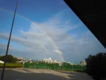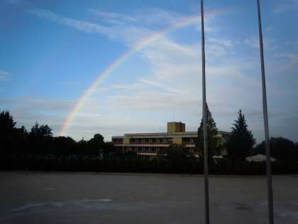 西の空にきれいな虹が出ていました。しかもよく見ると二重になっています。青空もしだいに増え、天気はどんどん回復していきそうです。運動場には水たまりがありますが、昼頃にはすっかり乾いて子どもたちが元気よく遊べるでしょう。