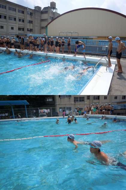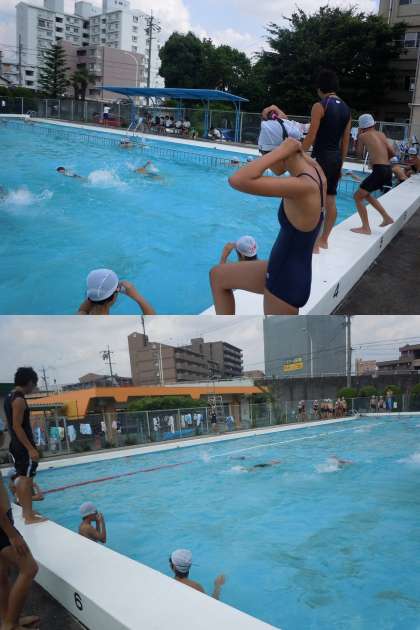 6年生 水泳指導 公開日 2014/06/26 更新日 2014/06/26 トピックス 6年生は、水泳チャレンジカードを使い、メダカレベルからイルカレベルまで個人の目標をはっきりさだめて泳力の向上につとめています。 イルカレベルでは、25mクロールが20秒以内25m平泳ぎが30秒以内と、速いタイムで泳ぐことにチャレンジしていました。