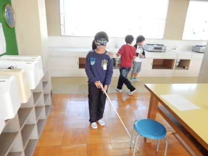 アイマスクをして校内をまわったり、白杖を使ったりして歩きました。