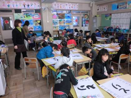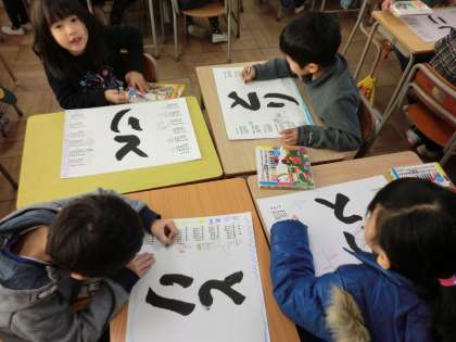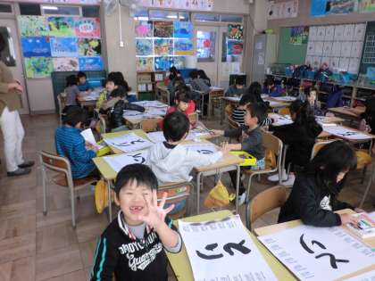 墨で書いたよ 公開日 2016/12/16 更新日 2016/12/16 トピックス 書の時間に、水習字で学習してきましたが、ついにこの日、本物の墨で書くことに挑戦しました。子どもたちは、少し緊張しながらも、力強く筆を使うことができました。