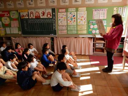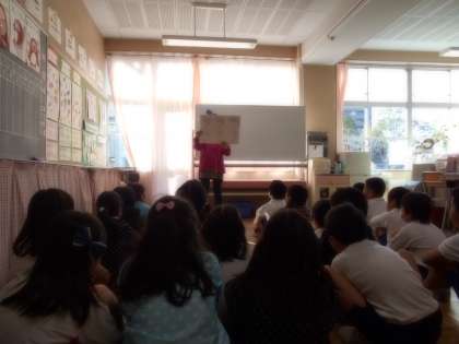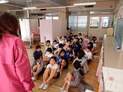 身長と体重を測る前に養護教諭から「熱が出るしくみ」の紙芝居を聞きました。また、体温計の正しい測り方を知ることができました。