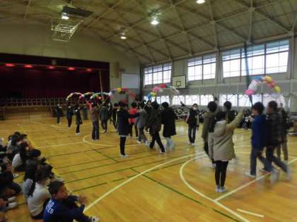 3月2日(木)の1・2時間目に卒業生を送る会がありました。6年生の入場と5年生総務委員による「はじめの言葉」です。