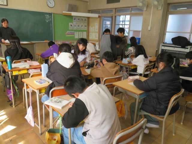 2組はテスト中でした。廊下に習字の作品が掲示してありました。