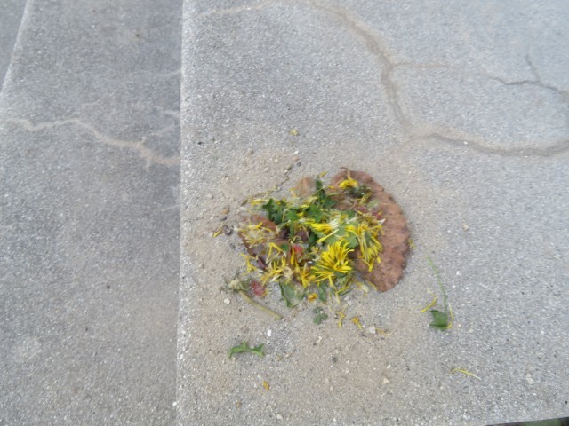 落ち葉をお皿にして、秋に咲くたんぽぽで遊んだ子がいたようです。