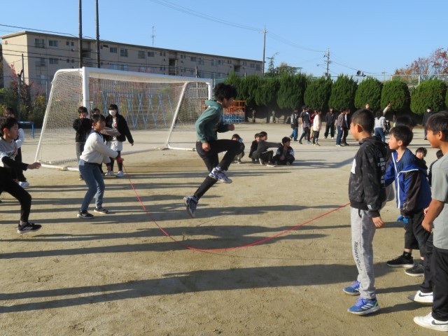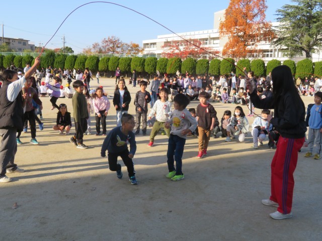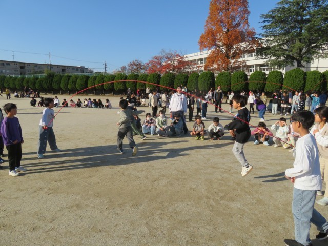 11月28日(金)の業前に全校児童による大縄跳び大会が行われました。各クラスは前・後半2チームに分かれ、3分間で跳ぶことができた回数の合計が2525(にこにこ)回を超えることを目指しました。結果は、4000回オーバーと目標を大きく上回りました。全校で力を合わせて目標を達成するという貴重な体験をすることができました。