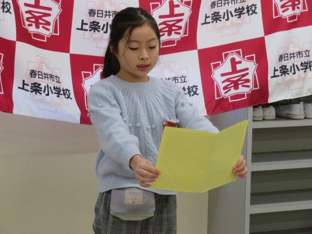 12月23日(火)の1時間目に、2学期終業式がありました。式の前に、2学期に作品コンクールやスポーツ大会で活躍した子どもたちが校長先生から表彰されました。次に、2年生と5年生の代表児童が、頑張ったことやこれから頑張りたいことを発表しました。終業式では、校長先生から童話「かしこいむすめ」を通して、困ったとき・迷ったときに「自分ならどうしますか?」と、よく考えることの大切さについてお話がありました。また、生徒指導担当教師からは、冬休みの過ごし方についてお話がありました。