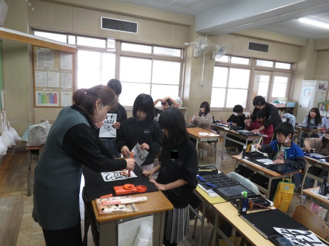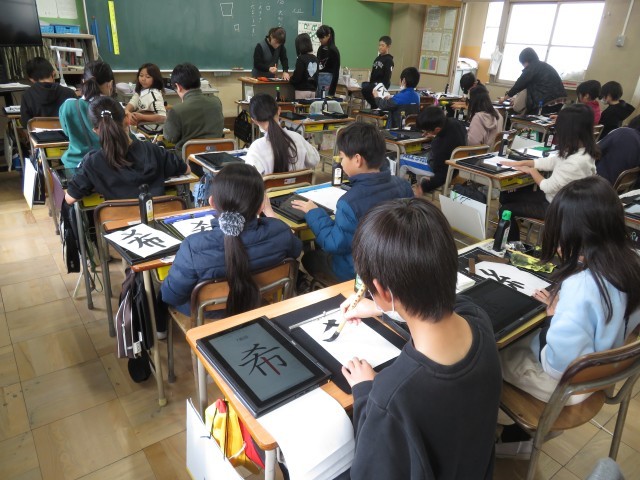 1組は書写で、自分で選んだ一文字を毛筆で書いていました。