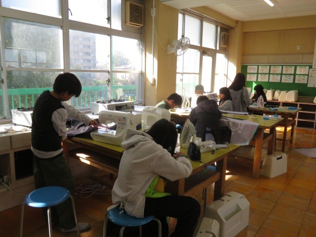 2組は家庭科で、エプロンを作っていました。