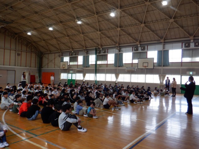 1時間目に、1年生と6年生が体育館に集まり、1年生を迎える会を行いました。