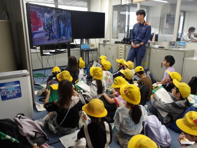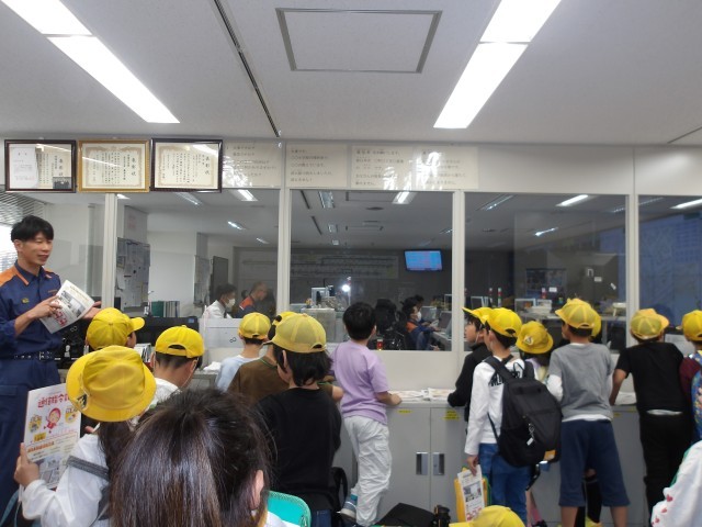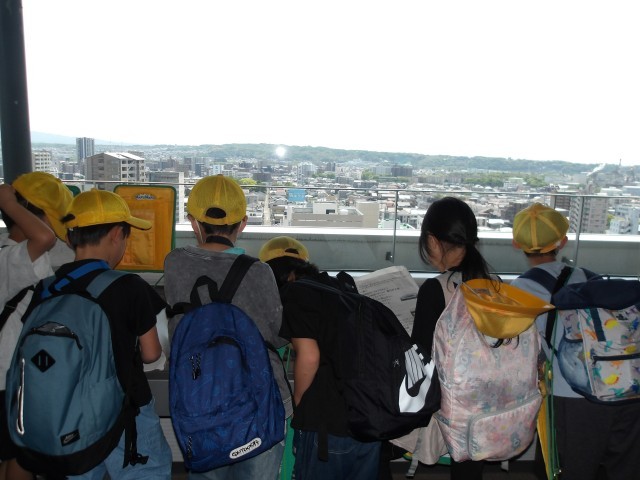 クラスごとに分かれて、市役所6階の通信指令室、12階の展望室、市役所周辺を周りました。