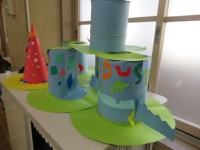 1組の教室には、作製中の帽子が並べてありました。2組は算数の授業中で、引き算の筆...