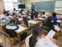 1組は、本の紹介カードを書いていました。2組はテスト中でした。廊下に習字の作品が掲示してありました。3組は、保健の授業に取り組んでいました。明日からいよいよ修学旅行です!