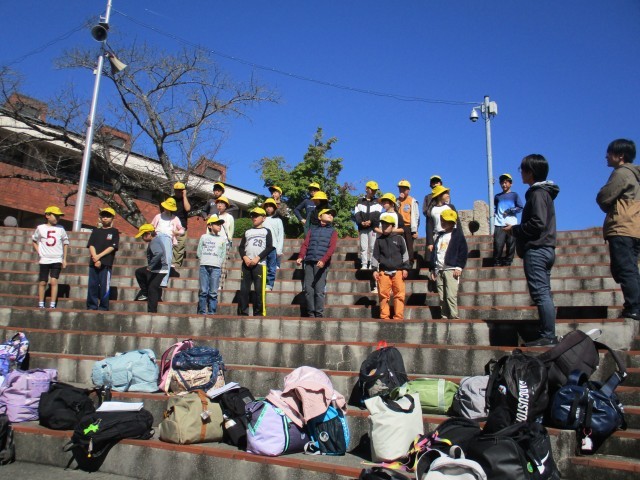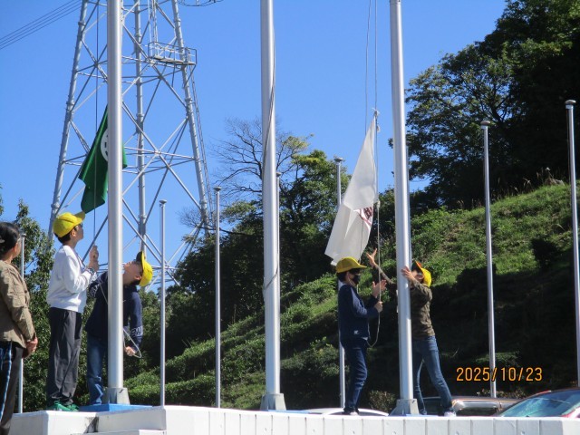食べ終わるといよいよ退所式。少年自然の家ともお別れです。昨日とは打って変わって素敵な青空、両校の校旗が気持ちよさそうです。