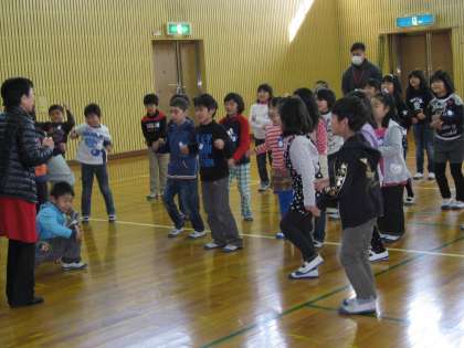 お話を聞いた後、ホールで、フォークダンスを教えていただきました。