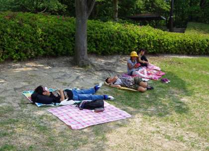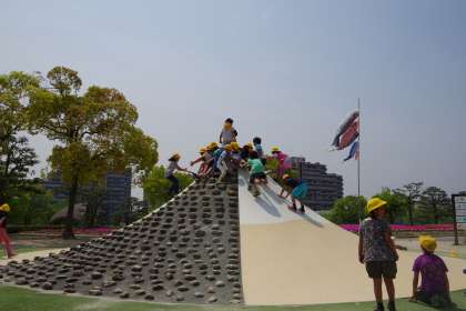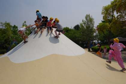 一番人気は山のすべり台でした!時折、熱中症予防のため休憩をとりました。日陰でのんびりしています。