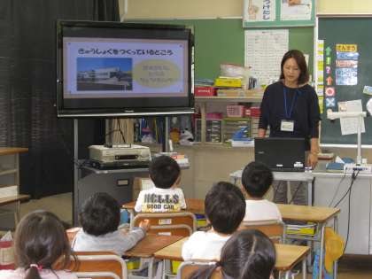 給食がどうやってできるのかを、東部調理場の栄養士さんに来ていただいて、お話していただきました。
